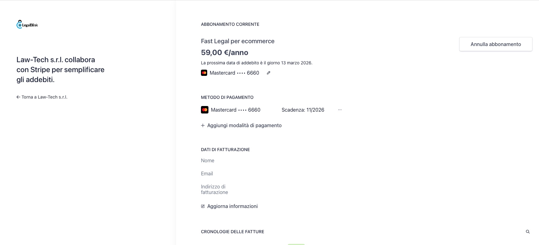 Verrai reindirizzato a una pagina esterna, sicura e gestita da Stripe/Law-Tech s.r.l., dove potrai gestire il tuo abbonamento attivo (come mostrato nell'immagine sotto stante).